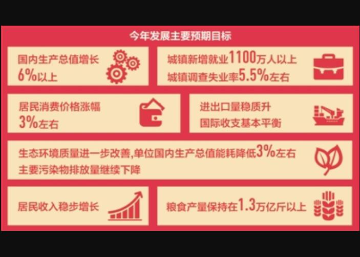 國內生產總值增長6%以上;城鎮新增就業1100萬人以上,城鎮調查失業率5 5%左右;居民消費價格漲幅3%左右