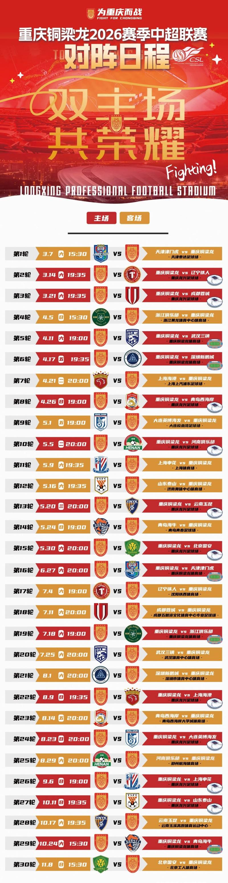 近日,重慶銅梁龍俱樂部公布了今年中超的完整賽程,其中10個主場在龍興足球場(包含揭幕戰(zhàn))、5個主場在銅梁龍體育場(包含收官戰(zhàn)),隨后